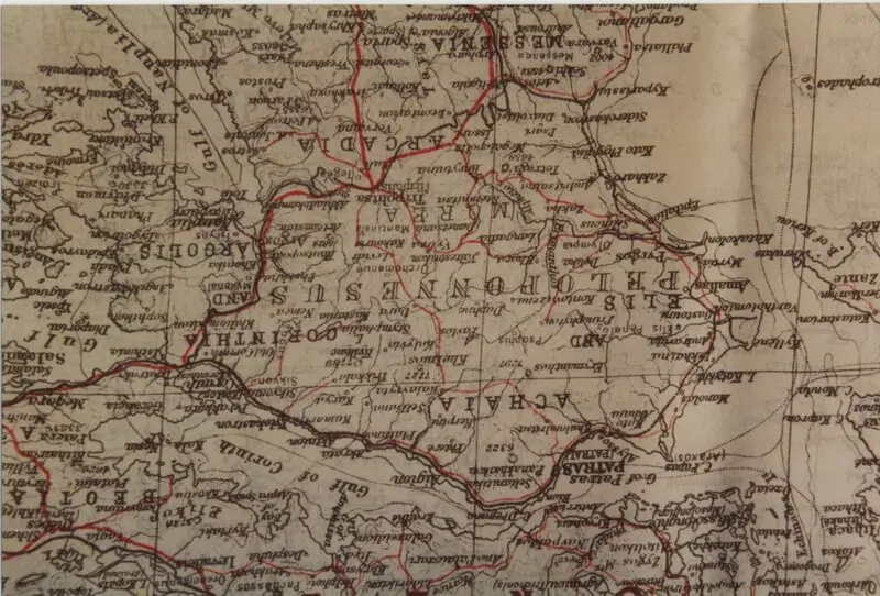 Φωτογραφία Στρατιωτικού Αγγλικού χάρτη της Ελλάδας. Διακρίνεται κυρίως η Πελοπόννησος. Ο χάρτης χρησιμοποιήθηκε από μέλη της Βρετανικής Στρατιωτικής Αποστολής την περίοδο της Κατοχή