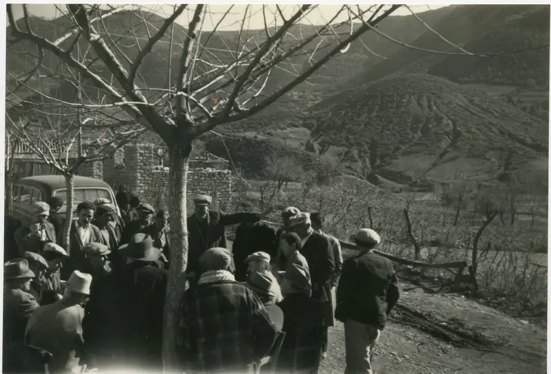 Συγκέντρωση κατοίκων, μετά τον Β' Παγκόσμιο Πόλεμο, πιθανώς στο χωριό Πριόλιθος Καλαβρύτων.