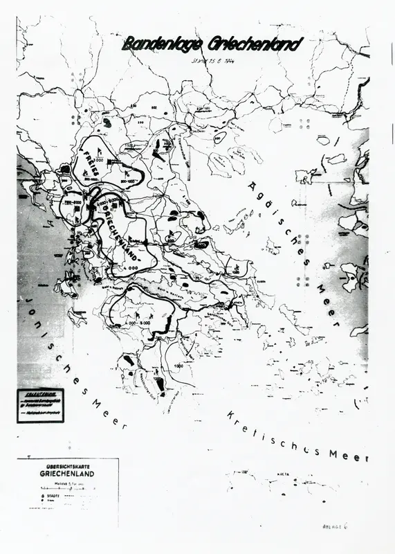 Αντίγραφο ενός γερμανικού στρατιωτικού χάρτη με την ένδειξη «Κατάσταση Αντιστασιακών Ομάδων στην Ελλάδα», που επισημαίνει γεωγραφικές περιοχές στην Ελλάδα κατά τη διάρκεια μιας Κατοχής και την δράση των Αντιστασιακών Ομάδων.