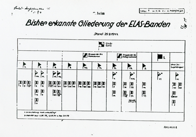 Αντίγραφο ενός γερμανικού στρατιωτικού σχεδιαγράμματος με την οργανωτική δομή του ΕΑΜ-ΕΛΑΣ ανά περιοχή τον Σεπτέμβριο του 1944.
