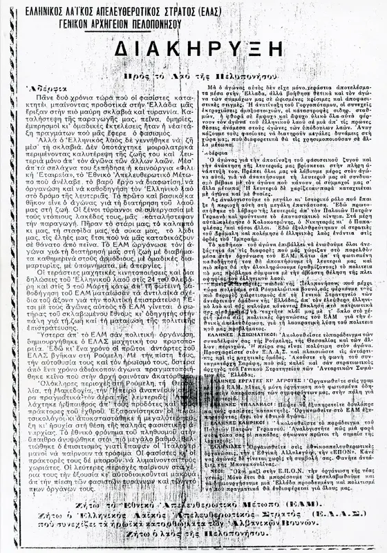 Αντίγραφο διακήρυηξς του Γενικού Ατχηγείου Πελοποννήσου του Ελληνικού Λαϊκού Απελευθερωτικού Στρατού (ΕΛΑΣ).