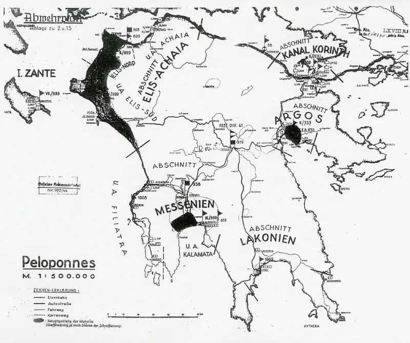 Αντίγραφο γερμανικού στρατιωτικού χάρτη που αφορά τον αμυντικό σχεδιασμός στην Πελοπόννησο το 1944.