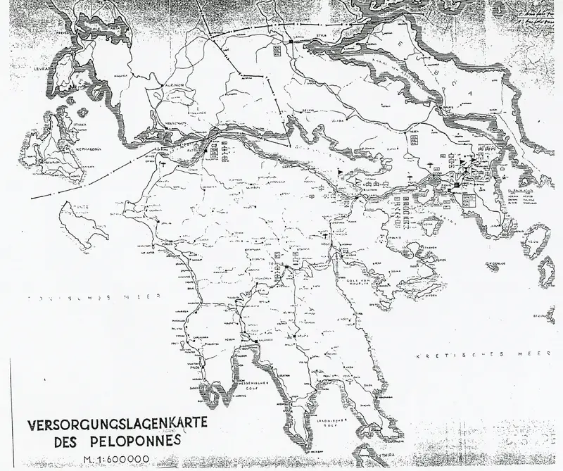 Αντίγραφο γερμανικού στρατιωτικού χάρτη που παρουσιάζει τον σχεδιασμό ανεφοδιασμού στην Πελοπόννησο.