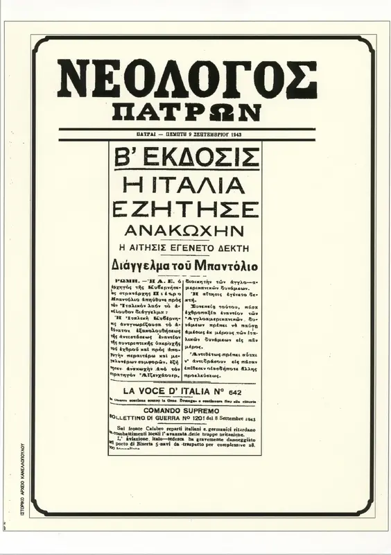 Αντίγραφο εξώφυλλου της εφημερίδας "Νεολόγος Πατρών" που έχει πρωτοσέλιδο την συνθηκολόγηση της Ιταλίας το 1943.