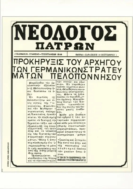 Αντίγραφο εξώφυλλου της εφημερίδας "Νεολόγος Πατρών" που έχει πρωτοσέλιδο την προκήρυξη του αρχηγού των Γερμανικών Στρατευμάτων στην Πελοπόννησο στις 10 Σεπτεμβρίου 1943.